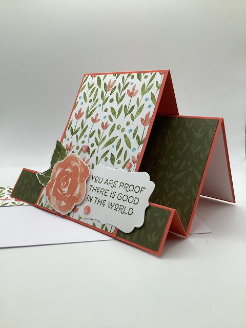 Adhere the front panel to the bottom strip of the step then adhere the other end to the top part of the back of the card. There will only be a slim margin to adhere. In the above photo, I added a piece of white card stock to cover the seam. Totally optional. The white card stock measures 2 7/8" x 5 3/8".